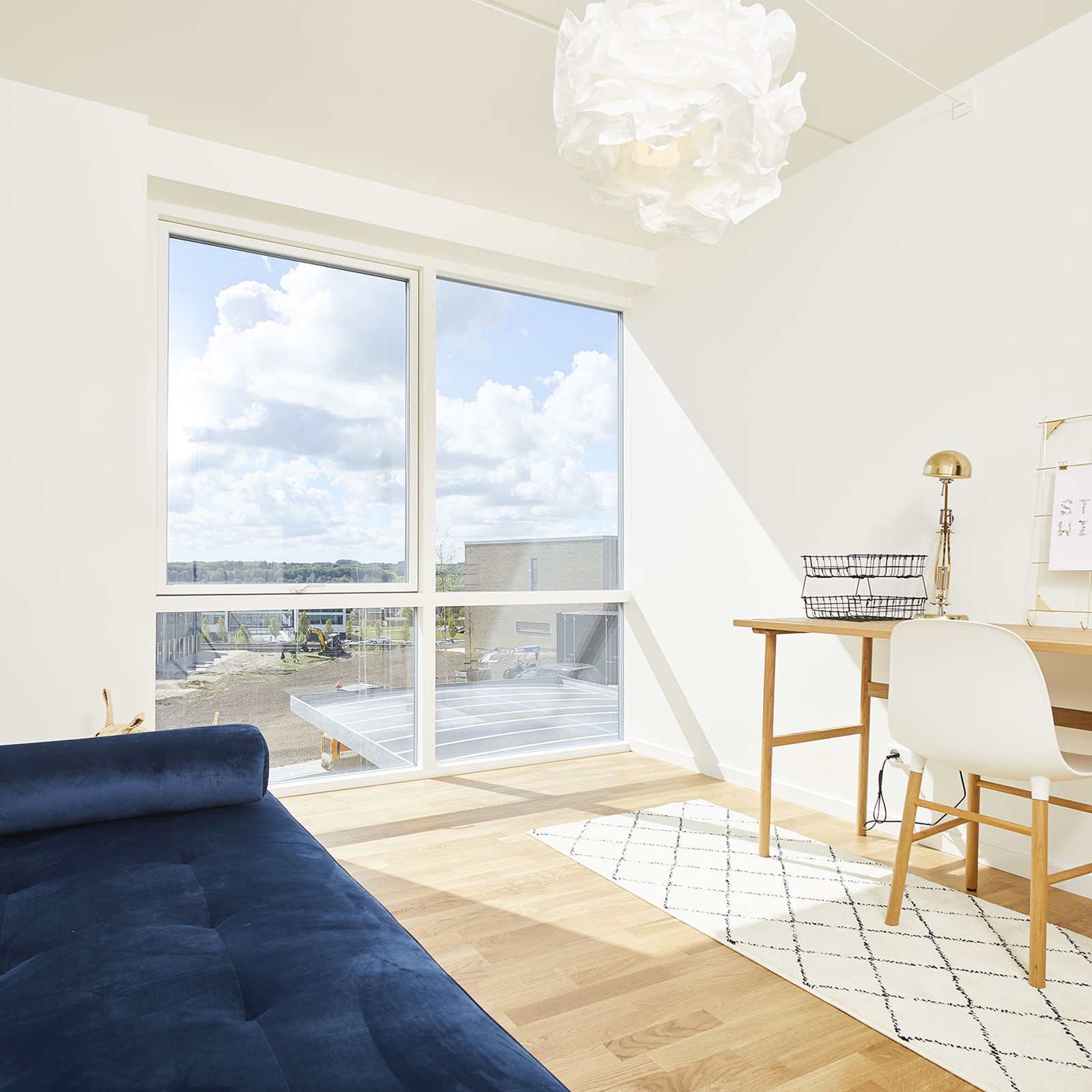 I dobbelthusene i HØIRIISPARKEN får du og dine kære hele 150 veludnyttede kvadratmeter at boltre jer på. De forskudte plan i stueetagen i køkken-alrum og opholdsstue giver nogle unikke indretningsmuligheder, og det ekstra høje rum med store sydvendte vinduespartier, sikrer et skønt lysindfald og optimal udnyttelse af udsigten til naturen.